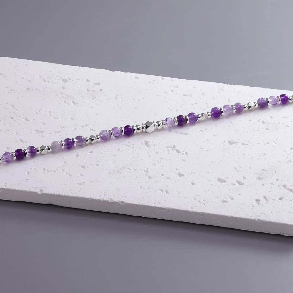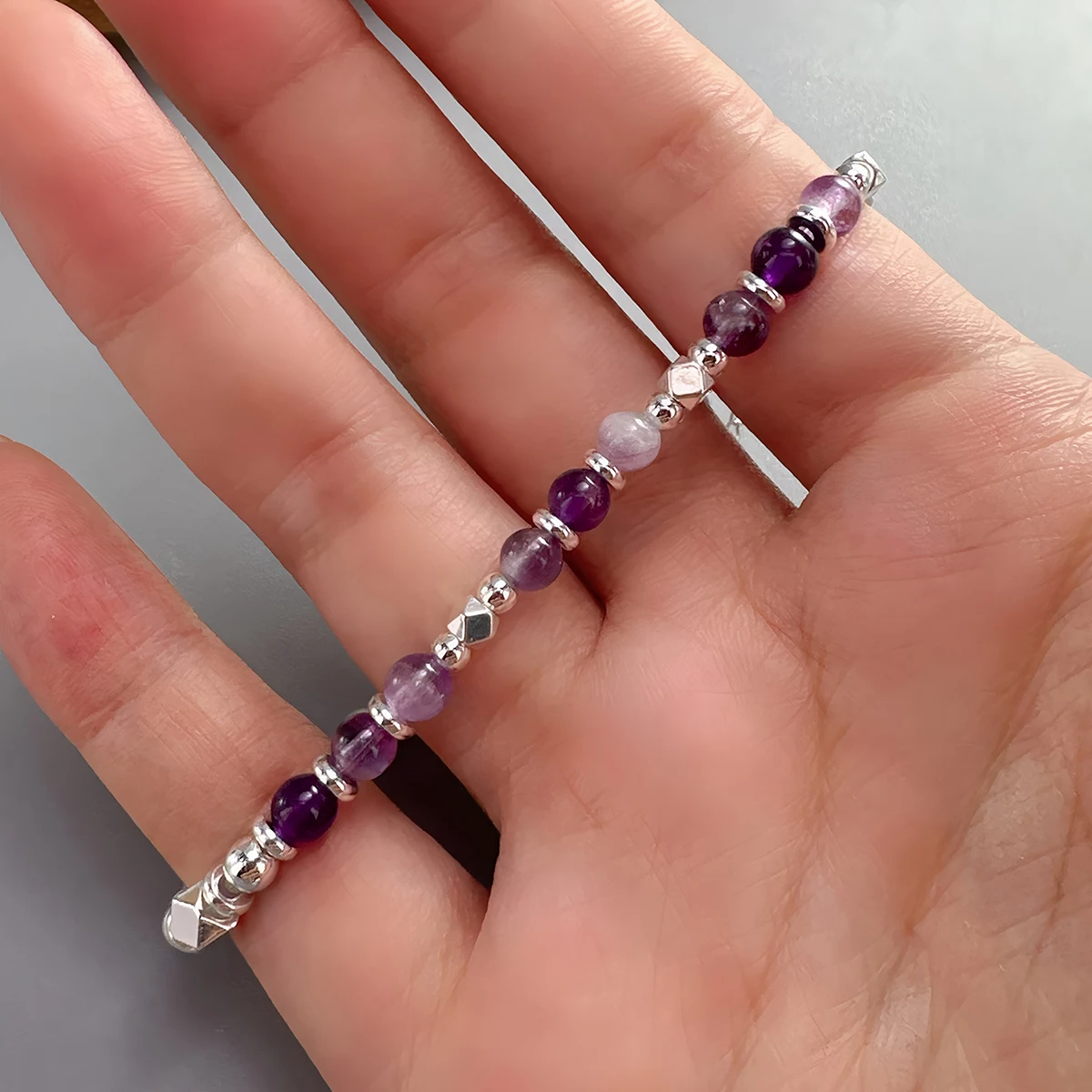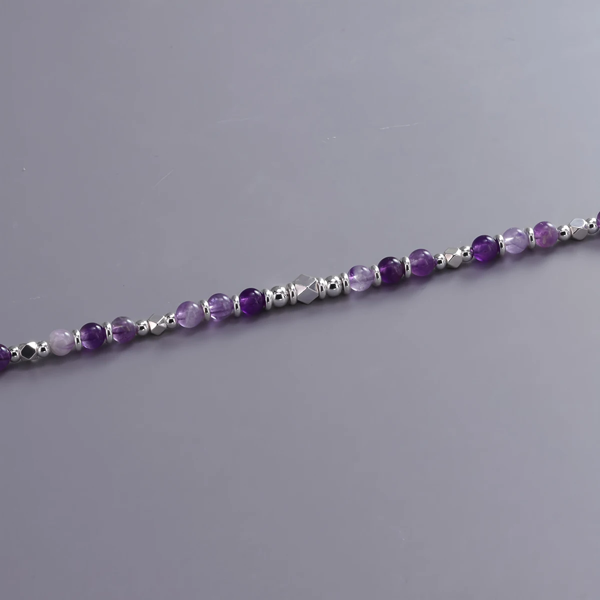 Add a touch of elegance and positive energy to your look with this Amethyst Silver Bead Bracelet. Each bead features natural amethyst gemstones known for their calming and protective properties. The rich purple tones pair beautifully with the polished silver accents, creating a timeless, stylish design. Made with durable elastic cord, it fits comfortably on most wrist sizes. Whether worn alone or stacked with other bracelets, it enhances any outfit effortlessly. Amethyst is often associated with peace, clarity, and emotional balance, making this bracelet both beautiful and meaningful. Perfect for daily wear, meditation, or special occasions. It’s lightweight and comfortable, ideal for long hours of use. The handcrafted design ensures quality and uniqueness in every piece. Give it as a thoughtful gift or treat yourself to a symbol of serenity and style.