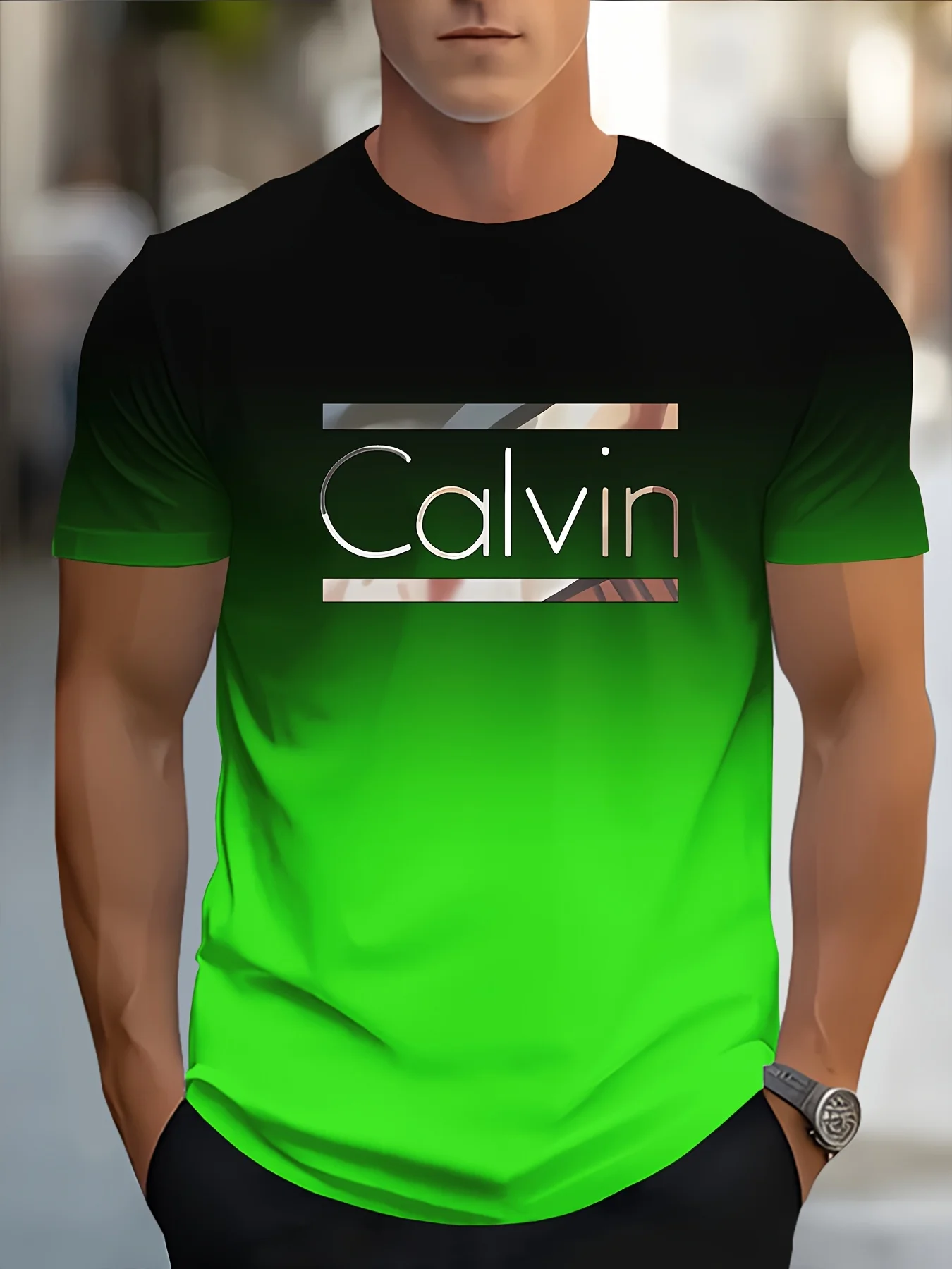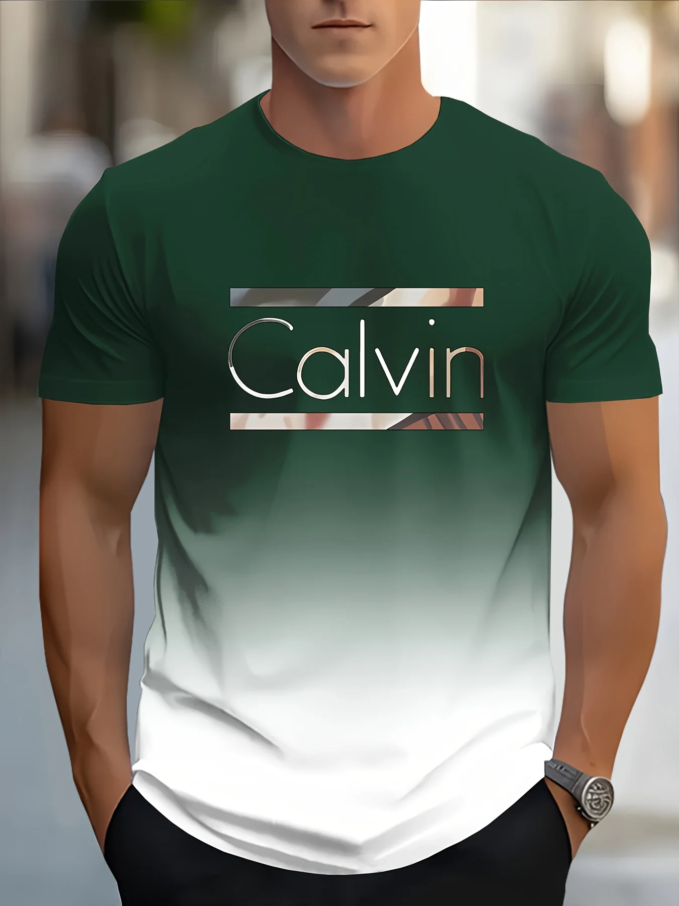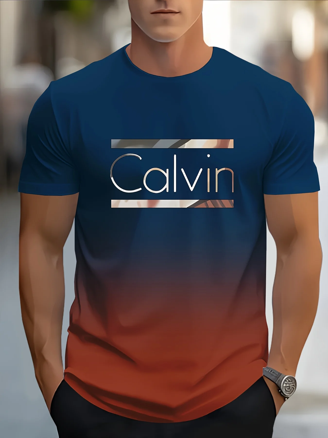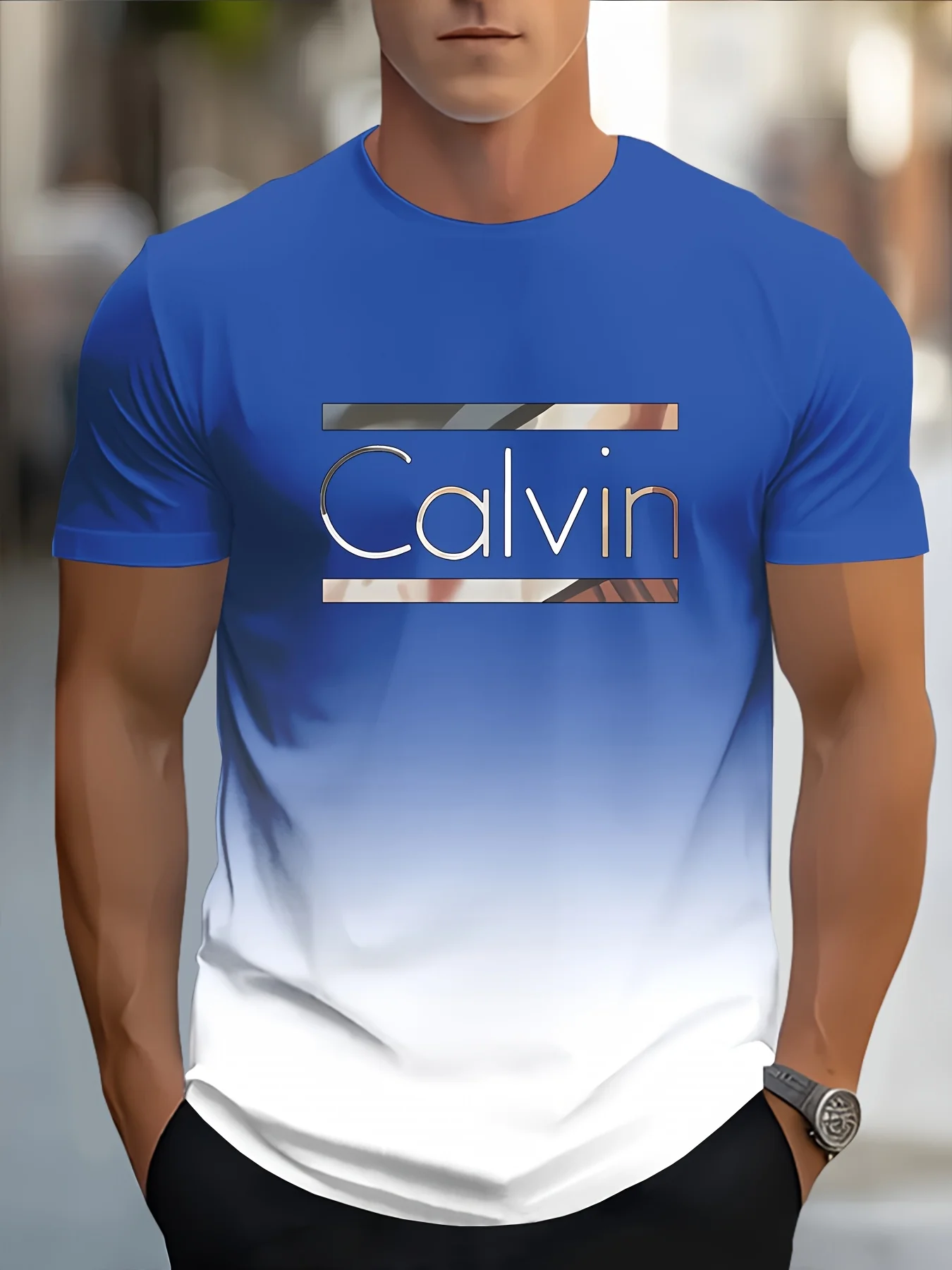 Upgrade your everyday style with this Men’s Casual Short Sleeve T-Shirt, featuring a bold CALVIN monogram print with a modern blue & white gradient design. Crafted from soft, breathable fabric, this T-shirt offers all-day comfort while maintaining a clean, fashionable look. The classic round neckline and regular fit make it easy to wear and style, whether paired with jeans, shorts, or joggers. Perfect for casual outings, streetwear, travel, or daily wear, this tee delivers effortless style with a trendy edge.